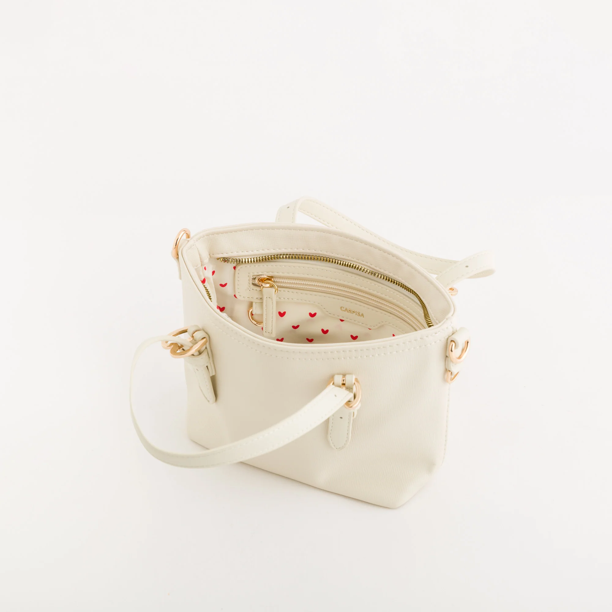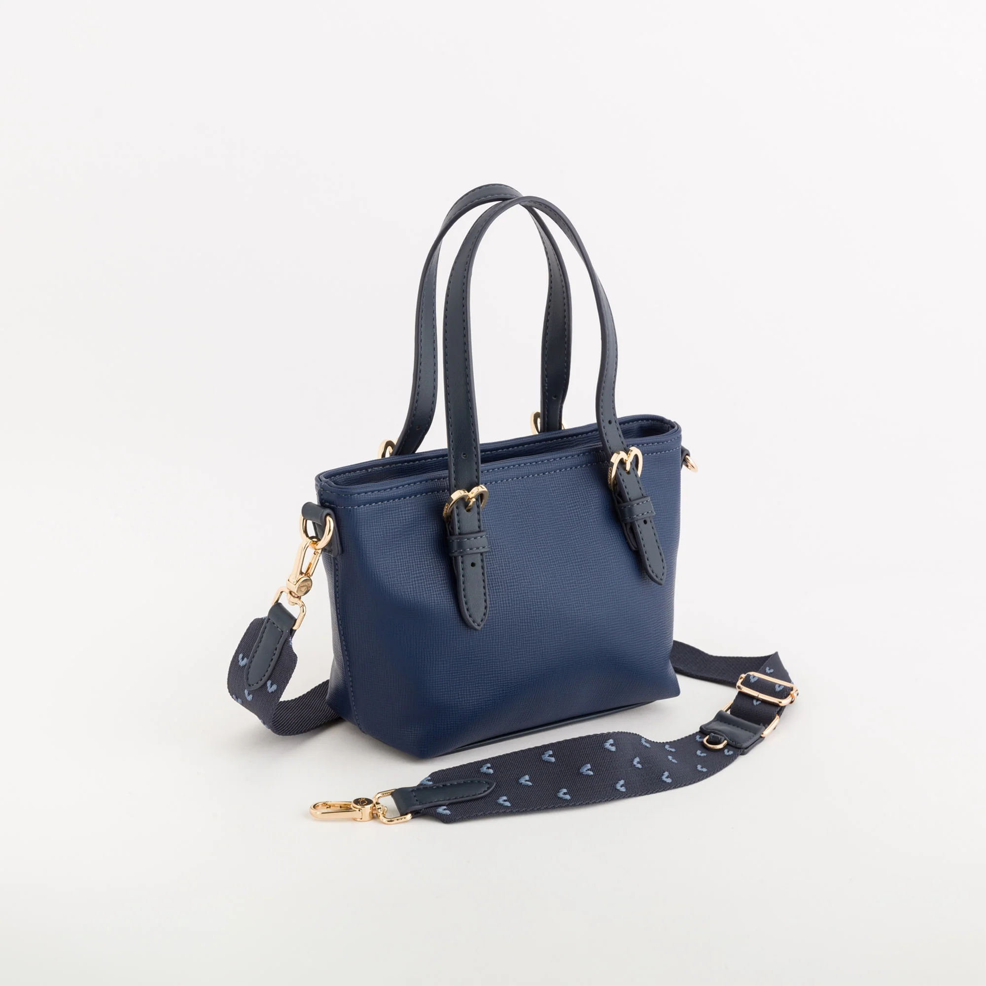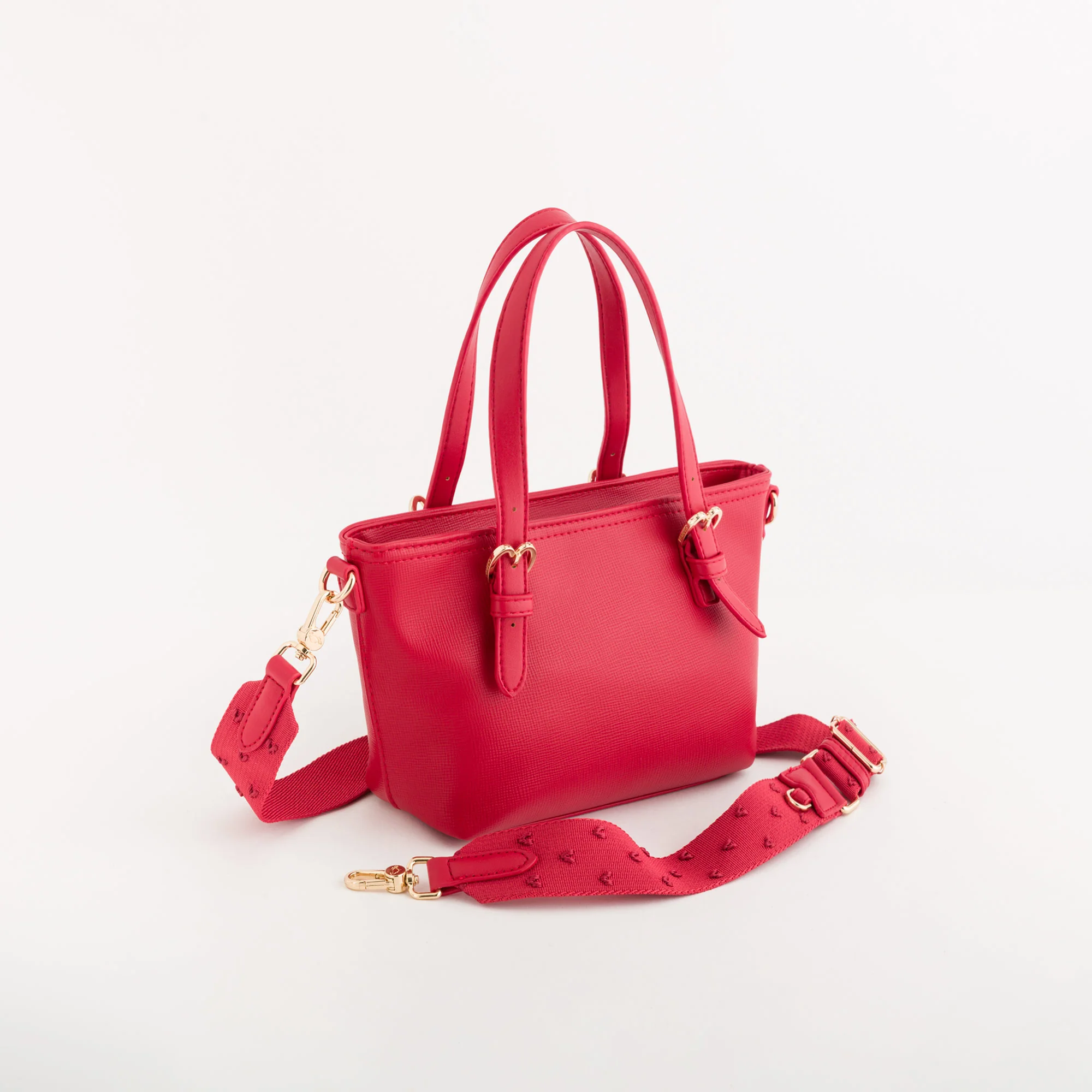 Il modello, dalle dimensioni contenute, è caratterizzato da chiusura con zip, tasca interna, manici regolabili, tracolla removibile in tessuto con cuoricino ricamato e anellino per aggiungere qualsiasi bag charm della collezione e personalizzare la propria borsa.