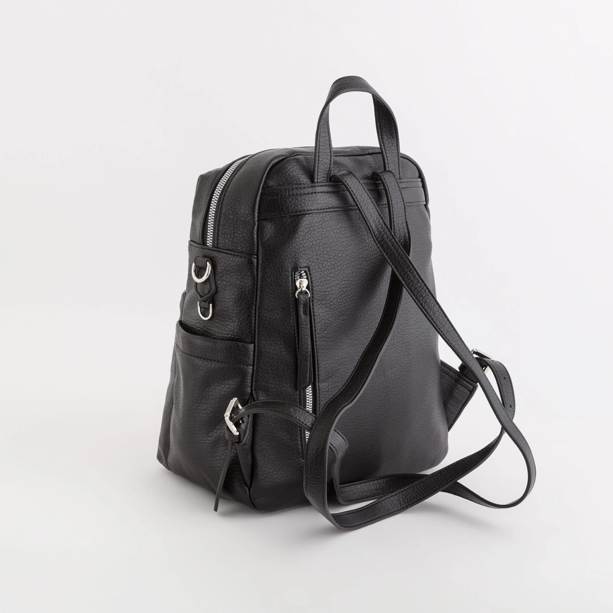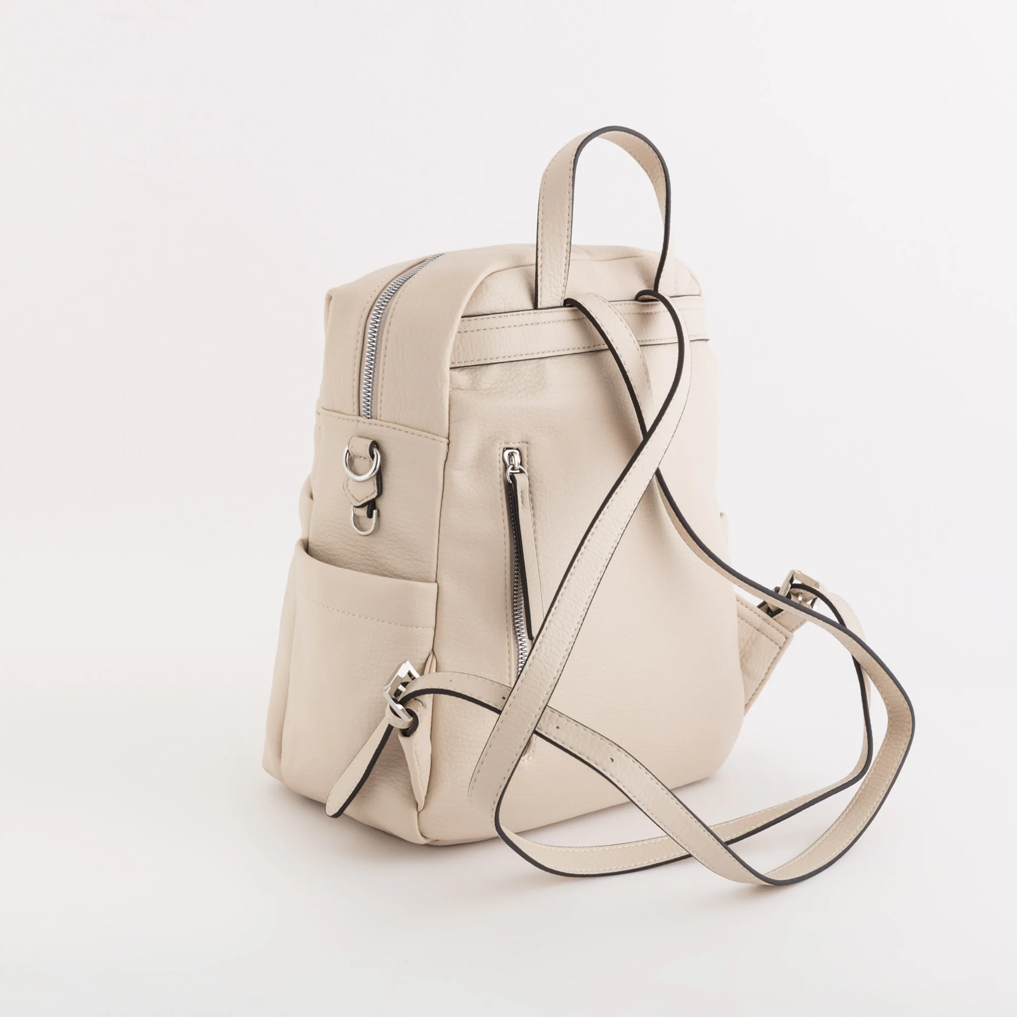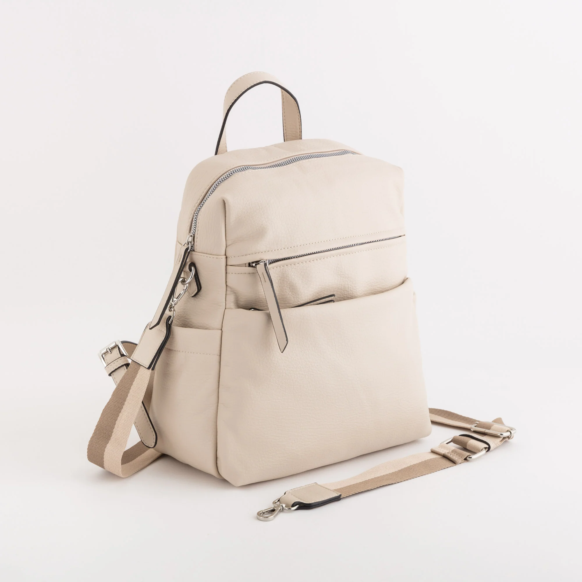 Il modello è dotato di chiusura con zip, due tasche sulla parte frontale, una tasca sul retro e due taschine laterali, manico superiore, spallacci regolabili e tracolla aggiuntiva in modo da indossare il prodotto sia come zaino che come tracolla.