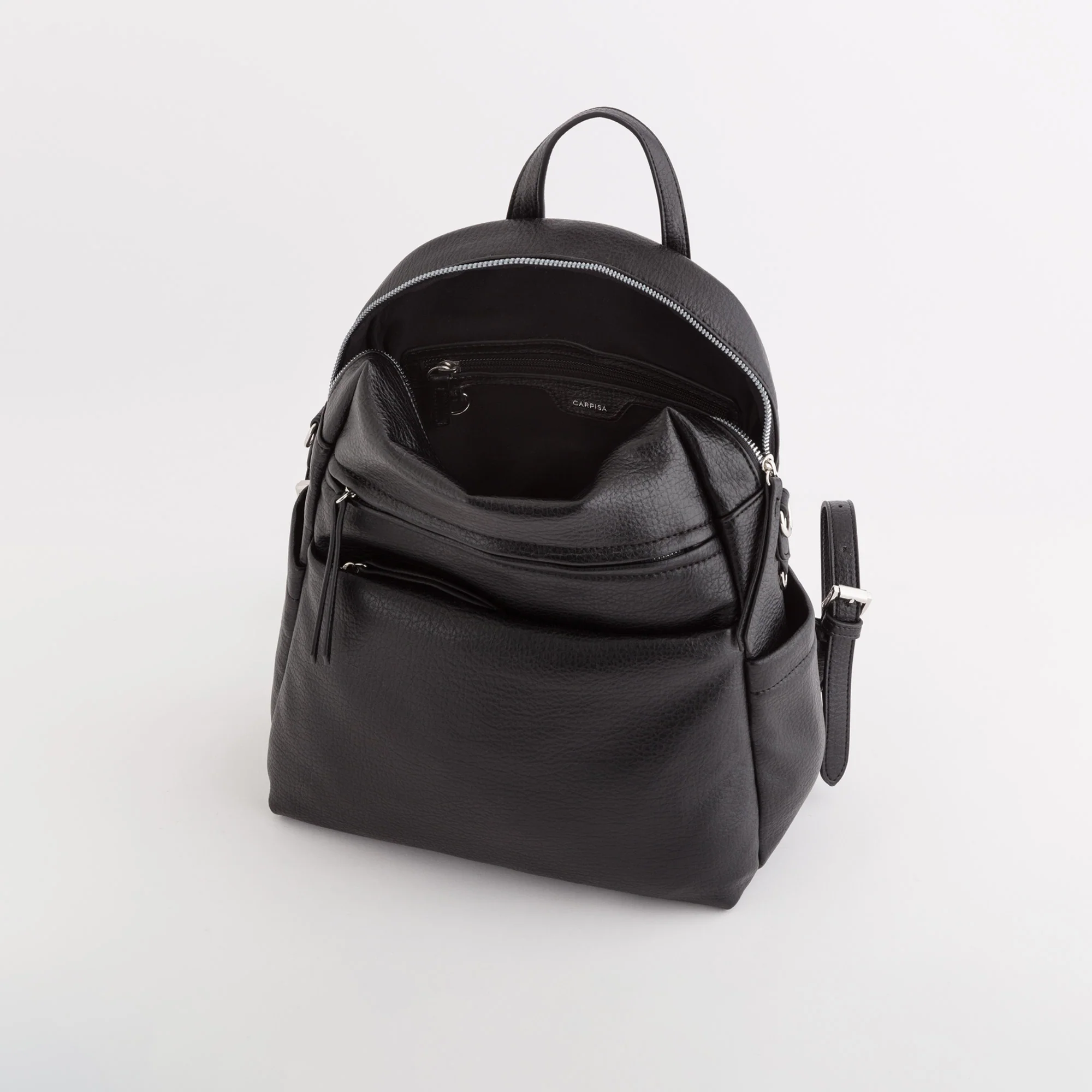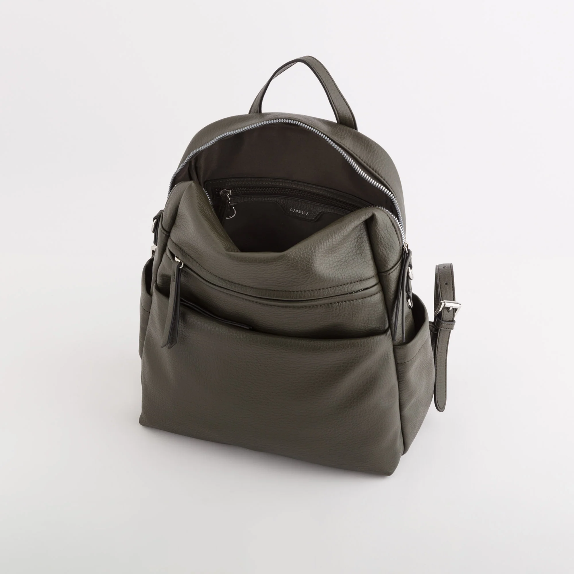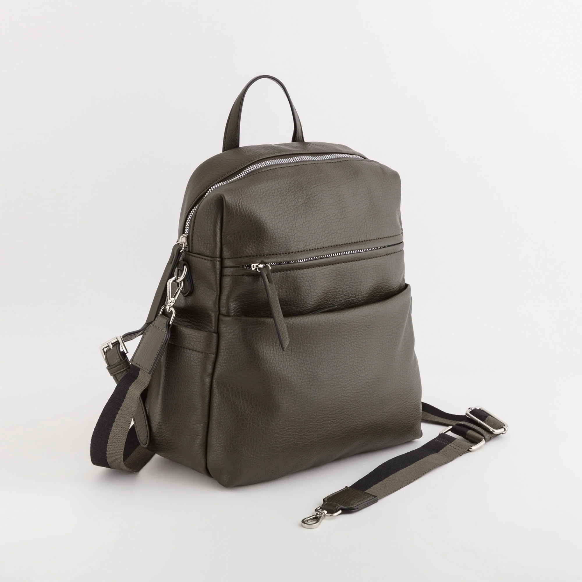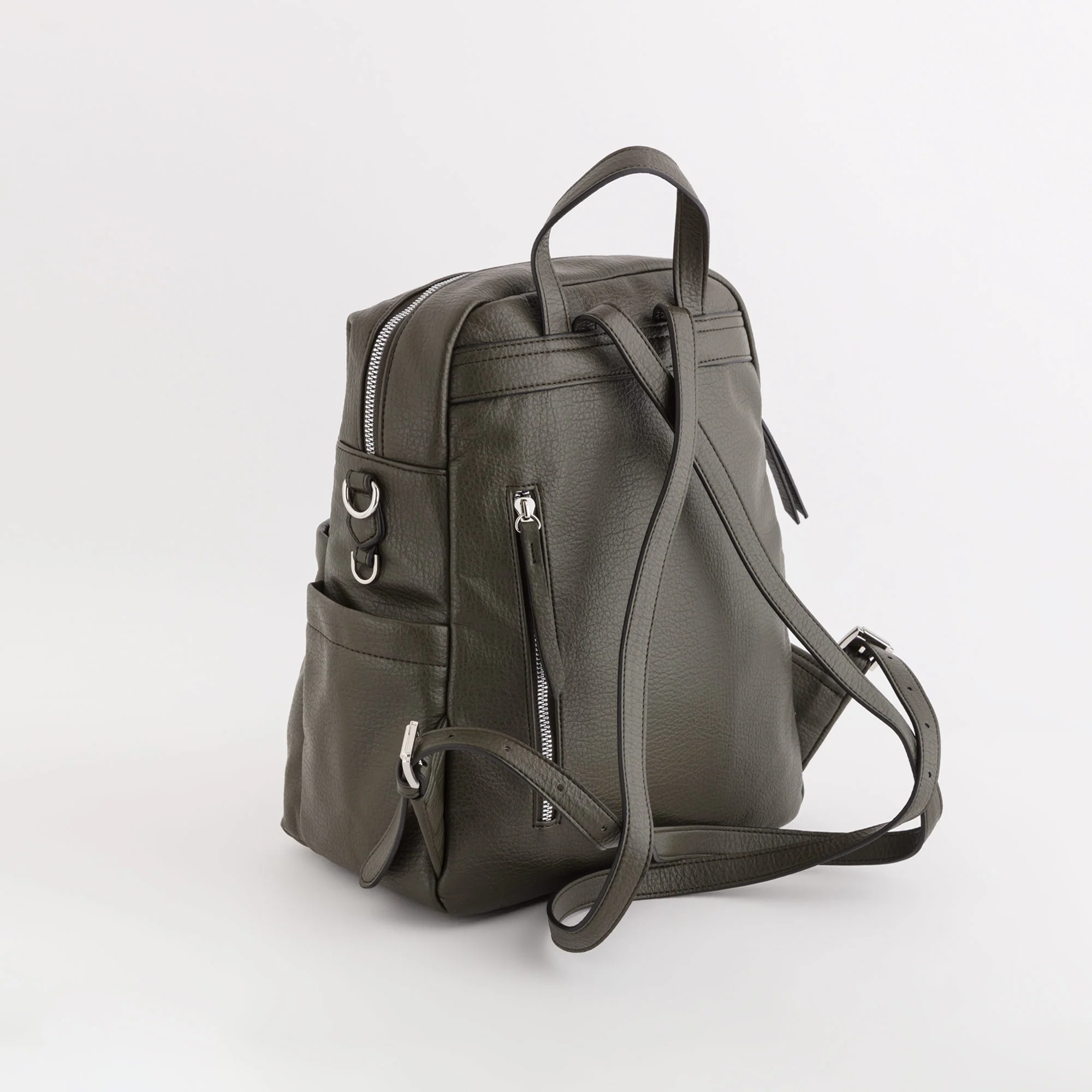 Il modello è dotato di chiusura con zip, due tasche sulla parte frontale, una tasca sul retro e due taschine laterali, manico superiore, spallacci regolabili e tracolla aggiuntiva in modo da indossare il prodotto sia come zaino che come tracolla.