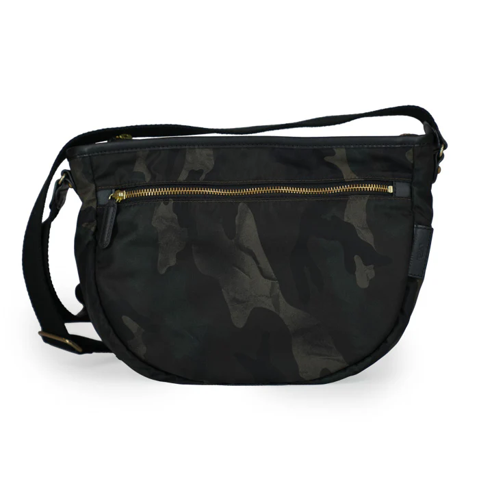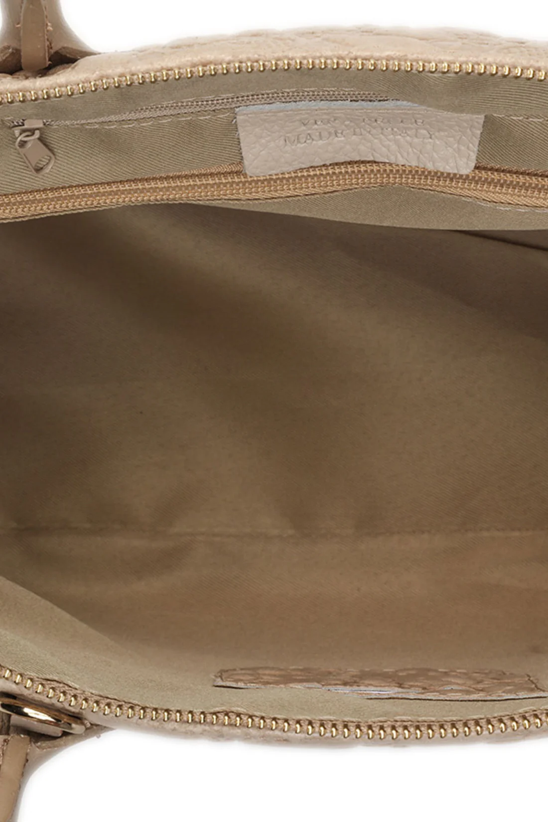 Design — Una struttura sofisticata e funzionale a tre scomparti, arricchita da accessori in metallo color oro, piedini protettivi sul fondo e una pratica tasca posteriore con zip per gli oggetti a portata di mano.
